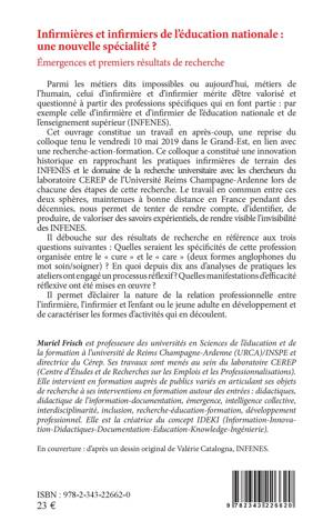 Parmi les métiers dits impossibles, celui d'infirmier mérite d'être valorisé et questionné par exemple celle d'infirmier de l'éducation nationale et de l'enseignement supérieur (INFENES). Cet ouvrage constitue un travail en après-coup, une reprise du colloque tenu dans le Grand-Est, en lien avec une recherche-action-formation. Ce colloque a constitué une innovation historique en rapprochant les pratiques infirmières de terrain des INFENES et le domaine de la recherche universitaire avec les chercheurs du laboratoire CEREP de l'Université Reims Champagne-Ardenne.