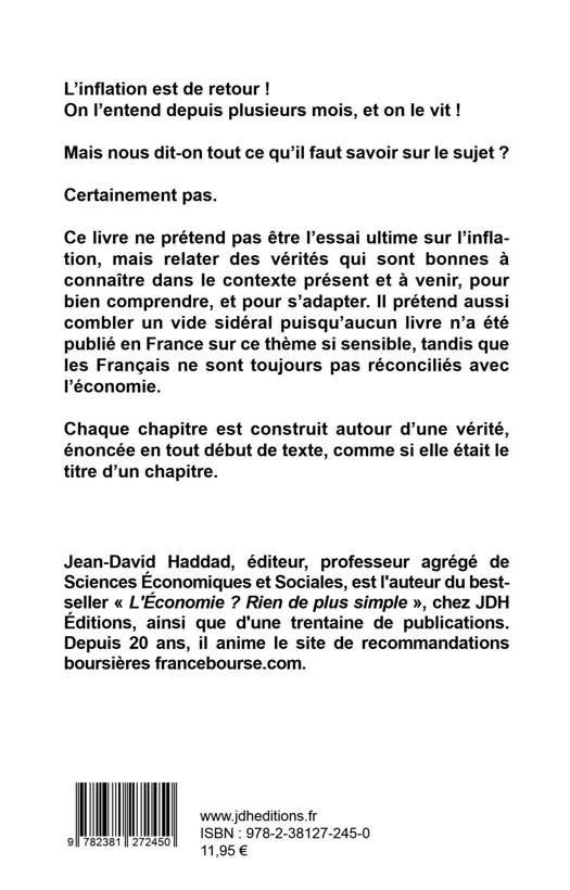 L'inflation est de retour ! On l'entend depuis plusieurs mois, et on le vit ! Mais nous dit-on tout ce qu'il faut savoir sur le sujet ? Certainement pas. Déjà, on ne nous dit pas que l'inflation enrichit les riches ! Il va de soi que, corrélativement, elle a tendance à appauvrir les pauvres. On ne nous dit pas que l'accélération de l'inflation que nous connaissons en 2022 est largement provoquée par les pouvoirs publics. On ne nous dit pas non plus que l'inflation, bien qu'absente des indices des prix à la consommation, est parmi nous depuis déjà un bon bout de temps. Et que les Français la ressentent sur leur pouvoir d'achat. On ne nous dit pas que face à l'inflation, il y a des stratégies à mettre en place pour son épargne, afin de réduire les risques. On ne nous dit pas que les mécanismes à l'oeuvre sont aussi ceux qui ont fait exploser les cryptomonnaies. Et on ne nous dit pas, tout simplement, ce qu'est l'inflation ! Ce livre ne prétend pas être l'essai ultime sur l'inflation, mais relater des vérités qui sont bonnes à connaître dans le contexte présent et à venir, pour bien comprendre, et pour s'adapter. Il prétend aussi combler un vide sidéral puisqu'aucun livre n'a été publié en France sur ce thème si sensible, tandis que les Français ne sont toujours pas réconciliés avec l'économie. Chaque chapitre est construit autour d'une vérité, énoncée en tout début de texte, comme si elle était le titre d'un chapitre.