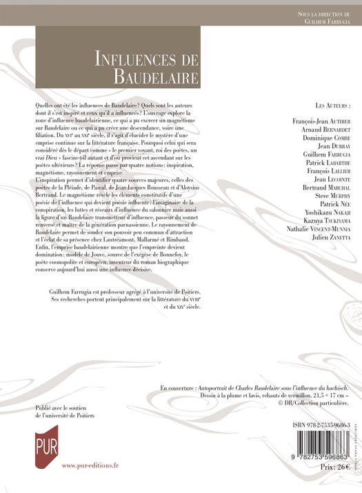 Quelles ont été les influences de Baudelaire ? Quels sont les auteurs dont il s’est inspiré et ceux qu’il a influencés ? L’ouvrage explore la zone d’influence baudelairienne, ce qui a pu exercer un magnétisme sur Baudelaire ou ce qui a pu créer une descendance, voire une filiation. Du XVIe au XXIe siècle, il s’agit d’élucider le mystère d’une emprise continue sur la littérature française. Pourquoi celui qui sera considéré dès le départ comme « le premier voyant, roi des poètes, un vrai Dieu » fascine-t-il autant et d’où provient cet ascendant sur les poètes ultérieurs ? La réponse passe par quatre notions : inspiration, magnétisme, rayonnement et emprise.