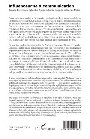 Ce numéro explore la constitution de l'influenceur-se en objet de recherche. Comment cette figure polymorphe s'est-elle structurée et quelles logiques organisent son activité ? De quelle façon les politiques publiques, les autorités de régulation et les acteurs du secteur publicitaire tentent-ils d'en redéfinir les contours et de se les approprier ? En mobilisant des approches interdisciplinaires en sciences de l'information et de la communication (sémiotique, sociologie, économie politique, études culturelles), les contributions analysent la fabrique médiatique, culturelle et économique de l'influenceur-se. Elles interrogent les trajectoires de professionnalisation ainsi que les tensions entre authenticité, marchandisation et visibilité, offrant une lecture indispensable des mutations contemporaines de la communication.