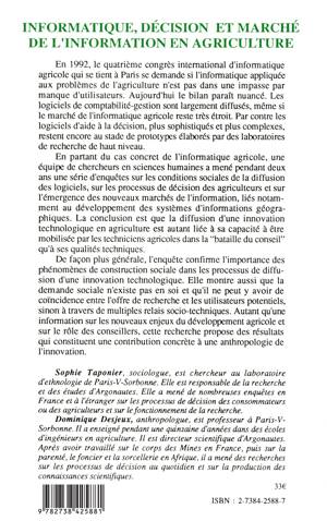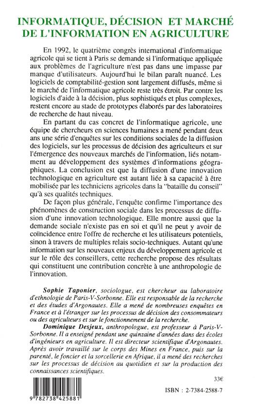 En 1992, le quatrième congrès international d'informatique agricole qui se tient à Paris se demande si l'informatique appliquée aux problèmes de l'agriculture n'est pas dans une impasse par manque d'utilisateurs. Aujourd'hui le bilan paraît nuancé. Les logiciels de comptabilité-gestion sont largement diffusés, même si le marché de l'informatique agricole reste très étroit. Par contre les logiciels d'aide à la décision, plus sophistiqués et plus complexes, restent encore au stade de prototypes élaborés par des laboratoires de recherche de haut niveau.