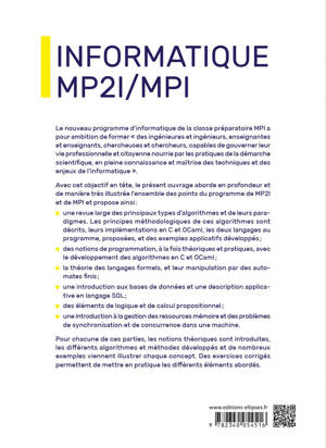 - une revue large des principaux types d’algorithmes et de leurs paradigmes. Les principes méthodologiques de ces algorithmes sont décrits, leurs implémentations en C et OCaml, les deux langages au programme, proposées, et des exemples applicatifs développés ;