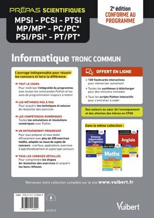 Destiné à tous les étudiants des classes préparatoires scientifiques en première et deuxième années, ce manuel rassemble un cours complet d’informatique avec ses fiches de synthèse ainsi que de nombreux exercices d’application corrigés. Il correspond à la partie du programme d'informatique dite "tronc commun" pour toutes les filières hors MP2I-MPI.