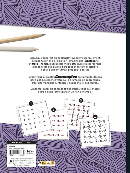 Bienvenue dans l’art du Zentangle®, synonyme d’amusement, de méditation et de relaxation ! Imaginé par Rick Roberts et Maria Thomas, il utilise des motifs structurés et coordonnés afin de créer des œuvres d’art, tout en restant accessible à ceux qui n’ont jamais pratiqué le dessin.