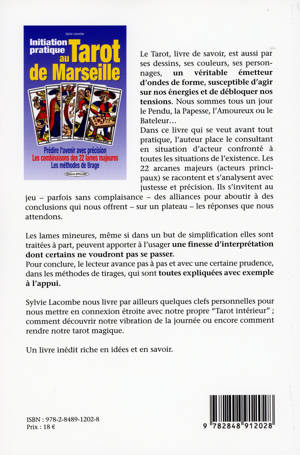 Les combinaisons des 22 lames majeures - Analyse des 78 lames - les tirages. Le tarot, livre de savoir, est aussi par ses dessins, ses couleurs, ses personnages, un véritable émetteur d'ondes de forme, susceptible d'agir sur nos énergies et de débloquer nos tensions. Nous sommes tous un jour le Pendu, la Papesse, l'Amoureux ou le Bateleur... Dans ce livre, l'auteur place le consultant en situation d'acteur confronté à toutes les situations de l'existence. Les 22 arcanes majeurs s'invitent au jeu parfois sans complaisance des alliances pour aboutir à des conclusions qui nous offrent sur un plateau les réponses que nous attendons. Les lames mineures, qui dans un but de simplification, sont traitées à part, peuvent apporter à l'usager une finesse d'interprétation dont certains ne voudront pas se passer. Pour conclure, le lecteur avance pas à pas et avec une certaine prudence, dans les méthodes de tirages, qui toutes sont expliquées avec exemple à l'appui. Sylvie Lacombe nous livre aussi quelques clefs personnelles pour nous mettre en connexion étroite avec notre propre "tarot intérieur".