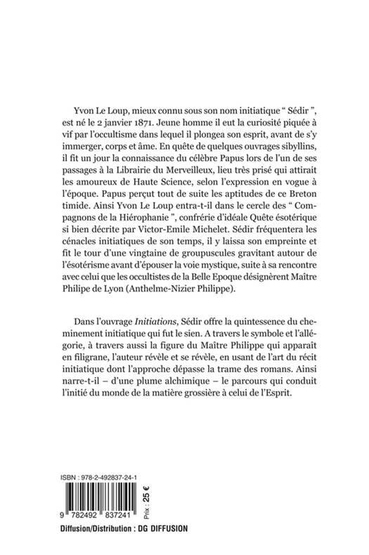 Dans l'ouvrage Initiations, Sédir offre la quintessence du cheminement initiatique qui fut le sien. A travers le symbole et l'allégorie, à travers aussi la figure du Maître Philippe qui apparaît en filigrane, l'auteur révèle et se révèle, en usant de l'art du récit initiatique dont l'approche dépasse la trame des romans. Ainsi narre-t-il -d'une plume alchimique le parcours qui conduit l'initié du monde de la matière grossière à celui de l'Esprit.