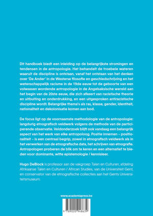 Dit handboek biedt een inleiding op de belangrijkste stromingen en tendensen in de antropologie. Het behandelt de troebele wateren waaruit de discipline is ontstaan, vanaf het ontstaan van het denken over 'De Ander' in de Westerse filosofie en geschiedschrijving en het wetenschappelijk racisme in de 19de eeuw tot de geboorte van een volwassen wordende antropologie in de Angelsaksische wereld aan het begin van de 20ste eeuw, die zich afkeert van racistische theorie en uitbuiting en onderdrukking, en een uitgesproken antiracistische discipline wordt.