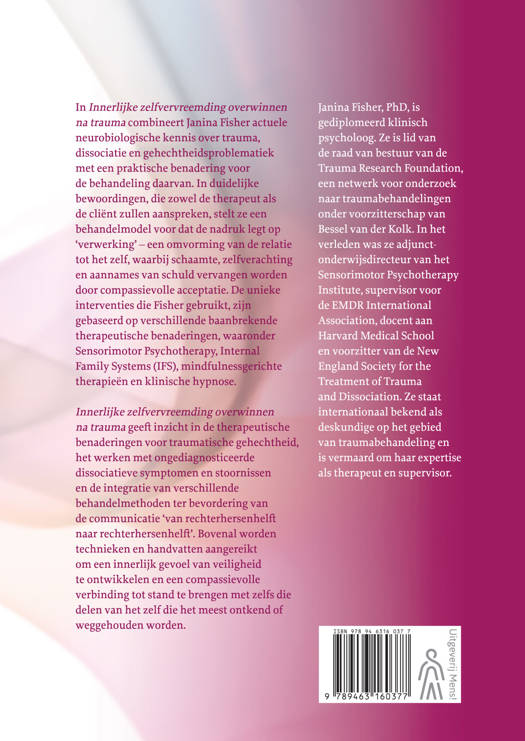 In 'Innerlijke zelfvervreemding overwinnen na trauma' combineert Janina Fisher actuele neurobiologische kennis over trauma, dissociatie en gehechtheidsproblematiek met een praktische benadering voor de behandeling daarvan. In duidelijke bewoordingen, die zowel de therapeut als de cliënt zullen aanspreken, stelt ze een behandelmodel voor dat de nadruk legt op ‘verwerking’ – een omvorming van de relatie tot het zelf, waarbij schaamte, zelfverachting en aannames van schuld vervangen worden door compassievolle acceptatie. De unieke interventies die Fisher gebruikt, zijn gebaseerd op verschillende baanbrekende therapeutische benaderingen, waaronder Sensorimotor Psychotherapy, Internal Family Systems (IFS), mindfulnessgerichte therapieën en klinische hypnose.