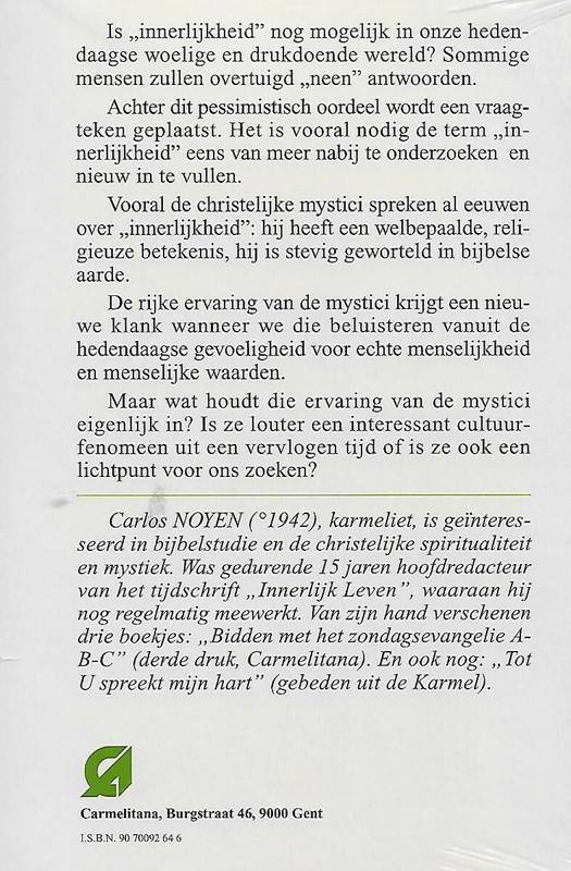 Is innerlijkheid nog mogelijk in onze hedendaagse woelige en drukdoende wereld? Sommige mensen zullen overtuigd 'neen' antwoorden. Achter dit pessimistisch oordeel wordt een vraagteken geplaatst. Het is vooral nodig de term 'innerlijkheid' eens van meer nabij te onderzoeken en nieuw in te vullen. Vooral de christelijke mystici spreken al eeuwen over innerlijkheid: hij heeft een welbepaalde, religieuze betekenis, hij is stevig geworteld in bijbelse aarde. De rijke ervaring van de mystici krijgt een neiuwe klank wanneer we die beluisteren vanuit de hedendaagse gevoeligheid voor echte menselijkheid en menselijke waarden. Maar wat houdt die ervaring van de mystici eigenlijk in? Is ze louter een interessant cultuurfenomeen uit een vervlogen tijd of is ze ook een lichtpunt voor ons zoeken?