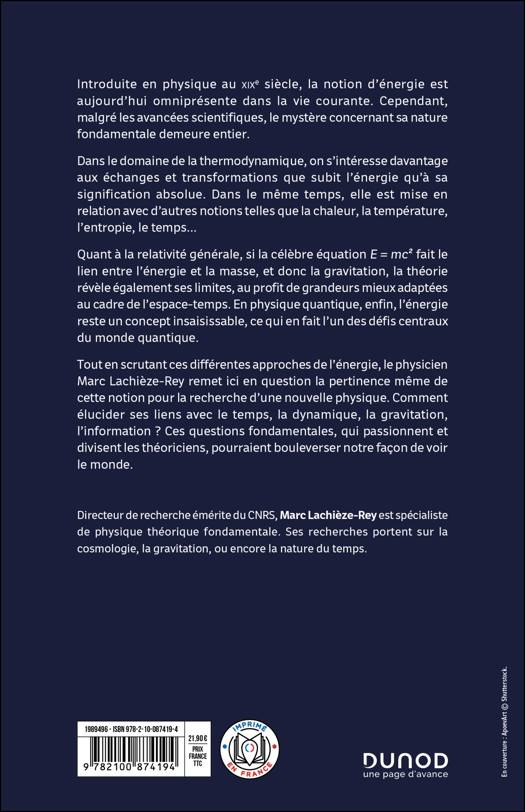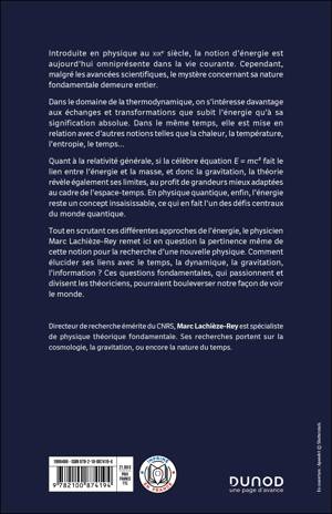 La notion d'énergie est omniprésente dans la vie courante. Elle fut introduite en physique au XIXe siècle, dans le cadre de la thermodynamique, ce qui dévoila ses liens intrinsèques avec des concepts tels que la chaleur, l'entropie, le travail et le rendement. Cependant, malgré toutes les avancées ultérieures, le mystère demeure concernant la nature fondamentale de l’énergie. Dans le domaine de la thermodynamique, l'accent est davantage mis sur les échanges énergétiques que sur une signification absolue de l'énergie. Quant à la relativité générale, si la célèbre équation E=mc² dévoile l'identité de l'énergie avec la masse, la théorie révèle également ses limites, notamment en remettant en question sa propriété fondamentale de conservation. En physique quantique enfin, l'énergie se révèle être un concept insaisissable, défiant toute tentative de définition cohérente, ce qui en fait l'une des énigmes centrales du monde quantique. Cette difficulté souligne les lacunes majeures de notre compréhension de la physique fondamentale contemporaine, notamment l'incompatibilité persistante entre la gravité et le monde quantique. Tout en scrutant ces différentes utilisations, Marc Lachièze-Rey remet ici en question la légitimité même de la notion d’énergie, ouvrant la voie vers une nouvelle physique.