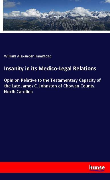 Insanity in its Medico-Legal Relations - Opinion Relative to the Testamentary Capacity of the Late James C. Johnston of Chowan County, North Carolina is an unchanged, high-quality reprint of the original edition of 1867. Hansebooks is editor of the literature on different topic areas such as research and science, travel and expeditions, cooking and nutrition, medicine, and other genres. As a publisher we focus on the preservation of historical literature. Many works of historical writers and scientists are available today as antiques only. Hansebooks newly publishes these books and contributes to the preservation of literature which has become rare and historical knowledge for the future.
