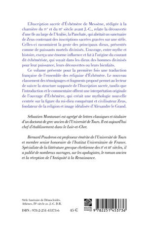 L'Inscription sacree d'Evhemere de Messene, redigee a la charniere du IVe et du IIIe siecle avant J.-C., relate la decouverte d'une ile au large de l'Arabie, la Panchaie, qui abritait un sanctuaire de Zeus contenant des inscriptions sacrees gravees sur une stele. Celles-ci racontaient la geste des principaux dieux, presentes comme de puissants mortels divinises. L'ouvrage, entre mythe et histoire, exerca une enorme influence et fut a l'origine du courant dit evhemeriste, qui voyait dans les dieux des hommes divinises pour leur puissance, leurs decouvertes ou leurs bienfaits. Ce volume presente pour la premiere fois une traduction francaise de l'ensemble des reliquiae d'Evhemere. Le nouveau classement des temoignages et fragments propose permet au lecteur de suivre la structure supposee de l'Inscription sacree, tandis que l'introduction et le commentaire offrent une interpretation originale de l'ouvrage d'Evhemere, qui creait une mythologie nouvelle centree sur la figure du roi-dieu conquerant et civilisateur Zeus, fondateur de la religion et image idealisee d'Alexandre le Grand.