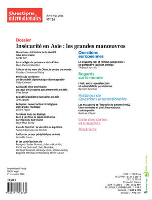 Ce numéro de Questions internationales analyse les nombreuses menaces qui planent actuellement sur l’Asie : essais balistiques nord-coréens vers la Corée du Sud ou le Japon, pressions chinoises en mer de Chine méridionale et sur Taïwan, retour des contentieux territoriaux en Asie du Sud Est, réengagement militaire des Etats-Unis, courses générale aux armements, émergence d’une nouvelle logique de blocs entre, d’un côté, la Corée du Sud, les États-Unis et le Japon, et, de l’autre, la Corée du Nord, la Chine et la Russie, risque de prolifération nucléaire …