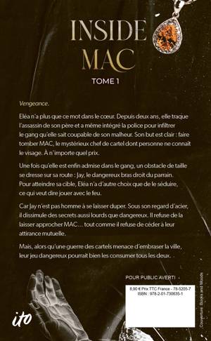 Vengeance. Eléa n’a plus que ce mot dans le cœur. Depuis deux ans, elle traque l’assassin de son père et a même intégré la police pour infiltrer le gang qu’elle sait coupable de son malheur. Son but est clair : faire tomber MAC, le mystérieux chef de cartel dont personne ne connaît le visage. À n’importe quel prix. Une fois qu’elle est enfin admise dans le gang, un obstacle de taille se dresse sur sa route : Jay, le dangereux bras droit du parrain. Pour atteindre sa cible, Eléa n’a d’autre choix que de le séduire, ce qui veut dire jouer avec le feu. Car Jay n’est pas homme à se laisser duper. Sous son regard d’acier se cache un homme aussi dangereux qu’énigmatique, qui dissimule ses propres secrets. Il refuse de la laisser approcher MAC… tout comme il refuse de céder à leur attirance mutuelle. Mais, alors qu’une guerre des cartels menace d’embraser la ville, leur jeu dangereux pourrait bien les consumer tous les deux.