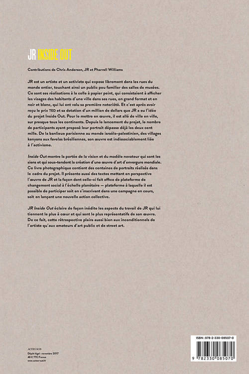 Cet ouvrage expose le projet d'art global collaboratif de l'artiste JR, Inside Out, qu'il a lancé en 2011: plusieurs centaines de milliers de personnes ont déjà participé dans 139 pays, s'emparant de leur image pour faire passer un message. «Inside Out» dévoile sa vision et son modèle novateur d'art à l'échelle mondiale. Riche de plusieurs centaines d'images du projet, le livre inclut également des contributions sur la manière dont l'art de JR, à travers une plateforme internationale, peut avoir une portée sociale.