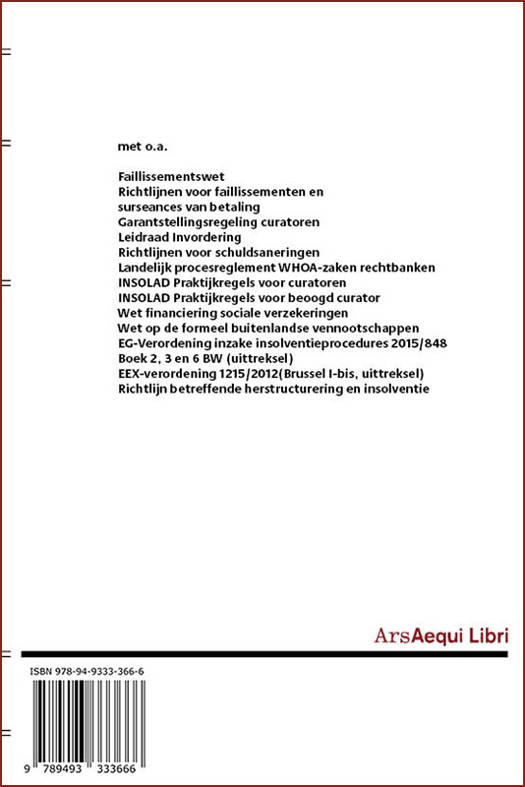Faillissementswet Richtlijnen voor faillissementen en surseances van betaling Beleidsregels voor inschrijving bewindvoerders Wsnp en bewindvoerderorganisaties Wsnp in het register II Garantstellingsregeling curatoren Leidraad Invordering Richtlijnen voor schuldsaneringen Landelijk procesreglement WHOA-zaken rechtbanken INSOLAD Praktijkregels voor curatoren INSOLAD Praktijkregels voor beoogd curator Wet financiering sociale verzekeringen Wet op de formeel buitenlandse vennootschappen EG-Verordening inzake insolventieprocedures 2015/848 Boek 2, 3 en 6 BW (uittreksel) EEX-verordening 1215/2012(Brussel I-bis herschikking, uittreksel) Richtlijn betreffende herstructurering en insolventie