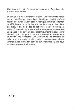 Texte traversé par le désir, le corps, le deuil et lamélancolie, qui parle de la fin d'un amour, de l'absence, du départ de l'hommequi retourne chez lui, en Argentine. La femme fuit son appartement, dort àl'hôtel, il l'appelle au téléphone, chaque nuit, puis elle bloque son numéro.Elle revient chez elle, essaie de vivre. Puis un jour.... il est là. Les dessins de Kent accompagnent ce texte, ilsdialoguent dans un récit intermittent jour/nuit fait de présence etd'absence à la fois. Un spectacle musical accompagne ce texte.