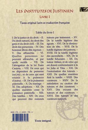 I. De la justice et du droit. - II. Du droit naturel, du droit des gens et du droit civil. - III. Du droit des personnes. - IV. Des hommes libres dits ingenuis. - V. Des affranchis. - VI. Quelles personnes ne peuvent affranchir, et par quels motifs. - VII. De l'abrogation de la loi Fusia Caninia. - VIII. De ceux qui ne dépendent de personne (sui jris) ; et de ceux qui sont soumis à la puissance d'autrui. - IX. De la puissance paternelle. - X. Du mariage. -XI. Des adoptions. - XII. De quelles manières cesse la puissance paternelle. - XIII. Des tutelles. - XIV. De ceux qui peuvent être nommés tuteurs par testament. - XV. De la tutelle légitime des agnats. - XVI. De la diminution de tête. - XVII. De la tutelle légitime des patrons. - XVIII. De la tutelle légitime des ascendants. - XIX. De la tutelle fiduciaire. - XX. Du tuteur Atilien, et de celui qui est donné conformément à la loi Julia et Titia. - XXI. De l'autorisation des tuteurs. - XXII. De quelles manières finit la tutelle. - XXIII. Des curateurs. - XXIV. De la satisdation ou caution des tuteurs et des curateurs. - XXV. Des excuses des tuteurs et des curateurs. - XXVI. Des tuteurs et des curateurs suspects.
