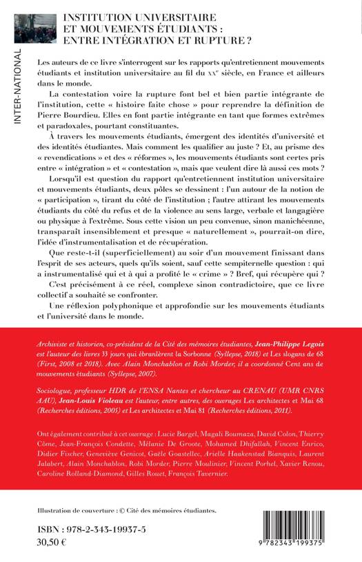 Les auteurs s'interrogent sur les rapports qu'entretiennent mouvements étudiants et institution universitaire au fil du XXe siècle, en France et ailleurs dans le monde. La contestation voire la rupture font bel et bien partie intégrante de l'institution, cette « histoire faite chose » pour reprendre la définition de Pierre Bourdieu. Elles en font partie intégrante en tant que formes extrêmes et paradoxales, pourtant constituantes. À travers les mouvements étudiants, émergent des identités d'université et des identités étudiantes. Mais comment les qualifier au juste ?