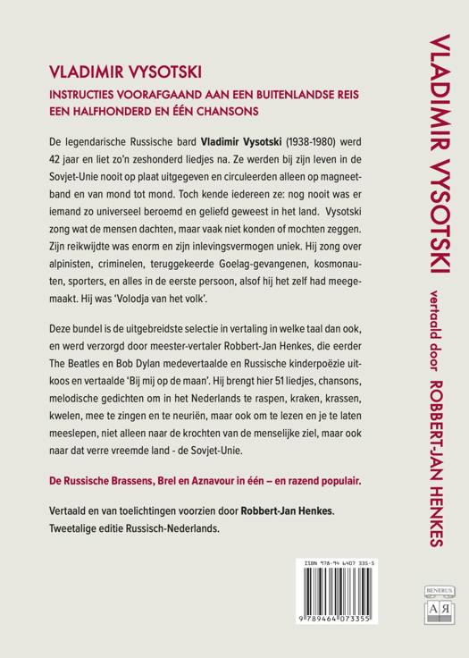 Deze bundel is de uitgebreidste selectie in vertaling in welke taal dan ook, en werd verzorgd door meester-vertaler Robbert-Jan Henkes, die eerder The Beatles en Bob Dylan mede vertaalde en Russische kinderpoëzie uitkoos en vertaalde (Bij mij op de maan). Hij brengt hier 51 liedjes, chansons, melodische gedichten om in het Nederlands te raspen, kraken, krassen, kwelen, mee te zingen en te neuriën, maar ook om te lezen en je te laten meeslepen, niet alleen naar de krochten van de menselijke ziel, maar ook naar dat verre vreemde land - de Sovjet-Unie.