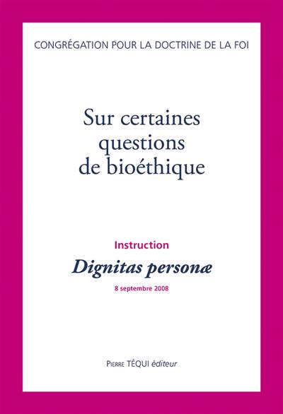 Dignitas Personae La dignité de la personne doit être reconnue à tout être humain depuis sa conception jusqu'à sa mort naturelle. En commençant ainsi cette nouvelle instruction, la Congrégation pour la Doctrine de la Foi, resituent l'objet de ce document : éclairer et alerter les consciences sur les pratiques bioéthiques actuelles. 3 parties : 1. Aspects anthropologiques, théologiques et éthiques de la vie et de la procréation humaine 2. Les nouveaux problèmes concernant la procréation 3. Nouvelles propositions thérapeutiques qui comportent la manipulation de l'embryon ou du patrimoine génétique humain. Nouvelles techniques : Technique de l'aide à la fertilité / fécondation in vitro et destruction délibérée des embryons / injection intracytoplasmique de spermatozoïdes / congélation des embryons / congélation d'ovocytes / réduction embryonnaire / diagnostique préimplantatoire / les nouvelles formes de contraceptions : interception et contragestion / clonage humain / utilisation thérapeutique de cellules souches / hybridation. Un document d'appui du Conseil pontifical pour la famille Lexique des termes ambigus et controversés sur la vie, la famille et les questions éthiques.