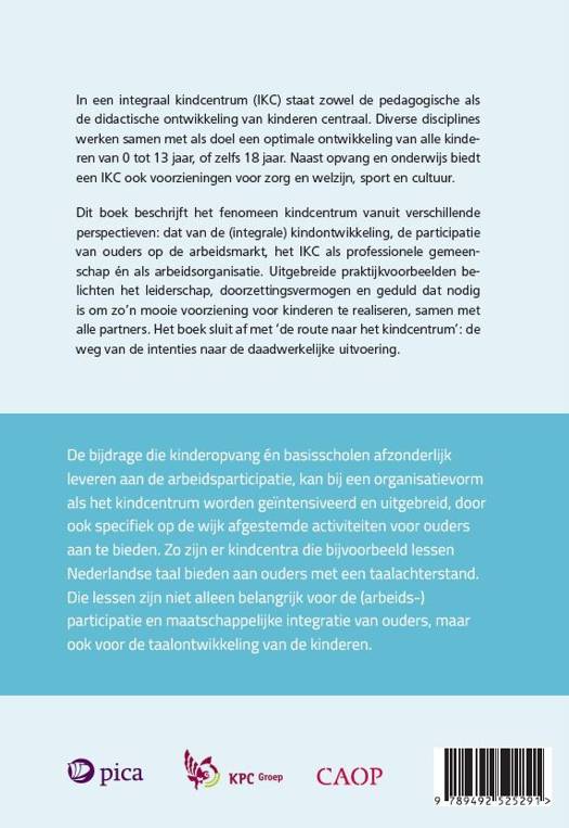 Dit boek beschrijft het fenomeen kindcentrum vanuit verschillende perspectieven: dat van de (integrale) kindontwikkeling, de participatie van ouders op de arbeidsmarkt, het IKC als professionele gemeenschap én als arbeidsorganisatie. Uitgebreide praktijkvoorbeelden belichten het leiderschap, doorzettingsvermogen en geduld dat nodig is om zo’n mooie voorziening voor kinderen te realiseren, samen met alle partners. Het boek sluit af met ‘de route naar het kindcentrum’: de weg van de intenties naar de daadwerkelijke uitvoering.