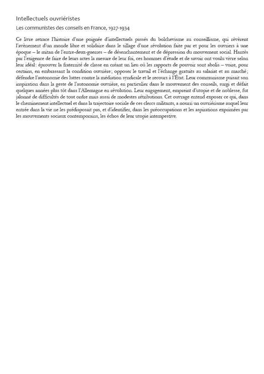Ce livre retrace l’histoire d’une poignée d’intellectuels passés du bolchevisme au conseillisme, qui rêvèrent l’avènement d’un monde libre et solidaire dans le sillage d’une révolution faite par et pour les ouvriers à une époque – le mitan de l’entre-deux-guerres – de désenchantement et de dépression du mouvement social. Hantés par l’exigence de faire de leurs actes la mesure de leur foi, ces hommes d’étude et de savoir ont voulu vivre selon leur idéal : éprouver la fraternité de classe en créant un lieu où les rapports de pouvoir sont abolis – voire, pour certains, en embrassant la condition ouvrière ; opposer le travail et l’échange gratuits au salariat et au marché ; défendre l’autonomie des luttes contre la médiation syndicale et le recours à l’État. Leur communisme puisait son inspiration dans la geste de l’autonomie ouvrière, en particulier dans le mouvement des conseils, surgi et défait quelques années plus tôt dans l’Allemagne en révolution. Leur engagement, empreint d’utopie et de noblesse, fut jalonné de difficultés de tout ordre mais aussi de modestes rétributions. Cet ouvrage entend exposer ce qui, dans le cheminement intellectuel et dans la trajectoire sociale de ces clercs militants, a nourri un ouvriérisme auquel leur entrée dans la vie ne les prédisposait pas, et d’identifier, dans les préoccupations et les aspirations exprimées par les mouvements sociaux contemporains, les échos de leur utopie intempestive.