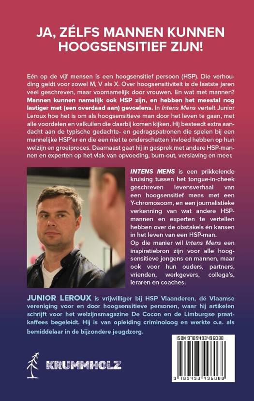 Eén op de vijf mensen is een hoogsensitief persoon (HSP). Die verhouding geldt voor zowel M, V als X. Over hoogsensitiviteit is de laatste jaren veel geschreven, maar voornamelijk door vrouwen. En wat met mannen? Mannen kunnen namelijk ook HSP zijn, en hebben het meestal nog lastiger met (een overdaad aan) gevoelens. In Intens Mens vertelt Junior Leroux hoe het is om als hoogsensitieve man door het leven te gaan, met alle voordelen en valkuilen die daarbij komen kijken. Hij besteedt extra aandacht aan de typische gedachte- en gedragspatronen die spelen bij een mannelijke HSP'er en die een niet te onderschatten invloed hebben op hun welzijn en groeiproces. Daarnaast gaat hij in gesprek met andere HSP-man-nen en experten op het vlak van opvoeding, burn-out, verslaving en meer. INTENS MENS is een prikkelende kruising tussen het tongue-in-cheek geschreven levensverhaal van een hoogsensitief mens met een Y chromosoom, en een journalistieke verkenning van wat andere HSP-mannen en experten te vertellen hebben over de obstakels én kansen in het leven van een HSP-man. Op die manier wil Intens Mens een inspiratiebron zijn voor alle hoog-sensitieve jongens en mannen, maar ook voor hun ouders, partners, vrienden, werkgevers, collega's, leraren en coaches.
