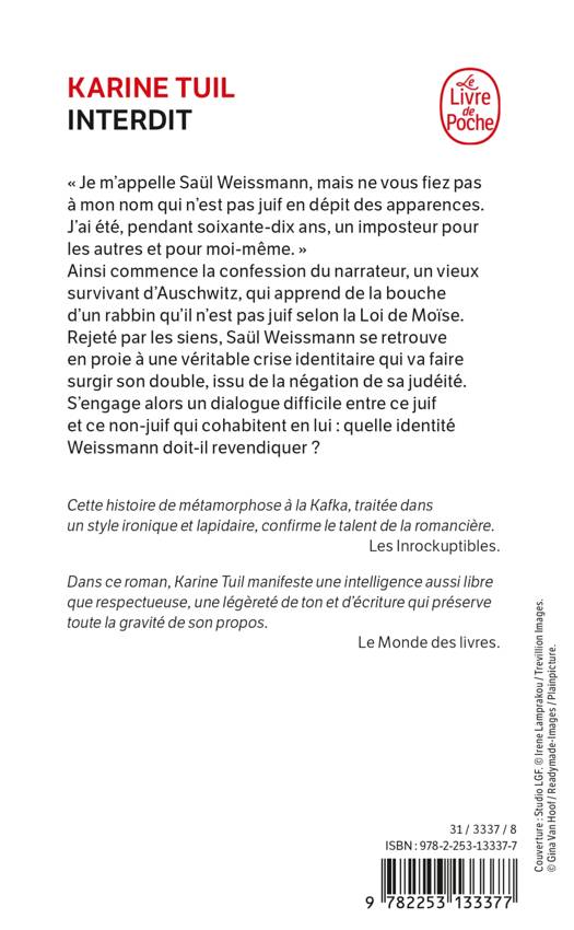 «Je m'appelle Saül Weissmann, mais ne vous fiez pas à mon nom qui n'est pas juif en dépit des apparences. J'ai été, pendant soixante-dix ans, un imposteur pour les autres et pour moi-même.» Ainsi commence la confession du narrateur, un vieux survivant d'Auschwitz qui apprend de la bouche d'un rabbin qu'il n'est pas juif selon la Loi de Moïse. Rejeté par les siens, Saül Weissmann se retrouve en proie à une véritable crise identitaire qui va faire surgir son double, issu de la négation de sa judéité. S'engage alors un dialogue difficile entre ce juif et ce non-juif qui cohabitent en lui : quelle identité Weissmann doit-il revendiquer ?