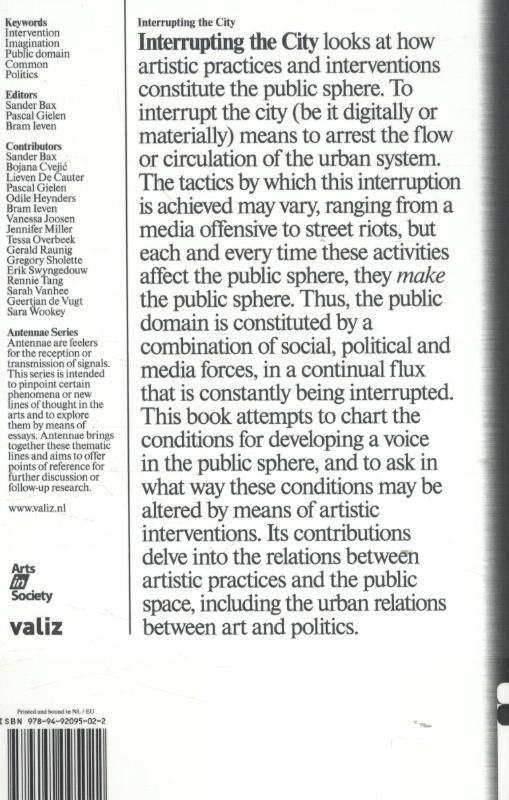 Interrupting the City explores the ways in which artistic practices and interventions intersect with the public sphere. The tactics by which an intervention is achieved may vary, ranging from a media offensive to a riot in the streets, but each time these activities affect the flow or circulation of urban public space, they also reconstitute it. Interrupting the City, edited by Sander Bax, Pascal Gielen and Bram Ieven, proposes the public sphere as a network of social, political and economic forces in constant flux, and attempts to chart the conditions under which art can contribute to or interrupt this process of the construction of public space. This volume brings together a range of internationally renowned theorists and artists to consider the relations between artistic activity and public space, and proposes how artists can develop their voices in the public sphere.