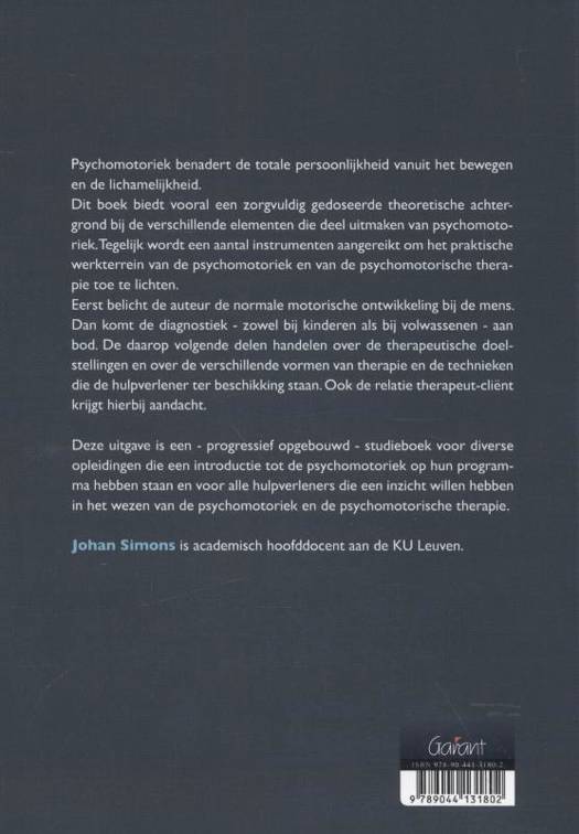 Psychomotoriek benadert de totale persoonlijkheid vanuit het bewegen en de lichamelijkheid. Dit boek biedt vooral een zorgvuldig gedoseerde theoretische achtergrond bij de verschillende elementen die deel uitmaken van psychomotoriek. Tegelijk wordt een aantal instrumenten aangereikt om het praktische werkterrein van de psychomotoriek en van de psychomotorische therapie toe te lichten. Eerst belicht de auteur de normale motorische ontwikkeling bij de mens. Dan komt de diagnostiek - zowel bij kinderen als bij volwassenen - aan bod. De daarop volgende delen handelen over de therapeutische doelstellingen en over de verschillende vormen van therapie en de technieken die de hulpverlener ter beschikking staan. Ook de relatie therapeut-cliënt krijgt hierbij aandacht. Deze uitgave is een - progressief opgebouwd - studieboek voor diverse opleidingen die een introductie tot de psychomotoriek op hun programma hebben staan en voor alle hulpverleners die een inzicht willen hebben in het wezen van de psychomotoriek en de psychomotorische therapie. Johan Simons is academisch hoofddocent aan de KU Leuven.
