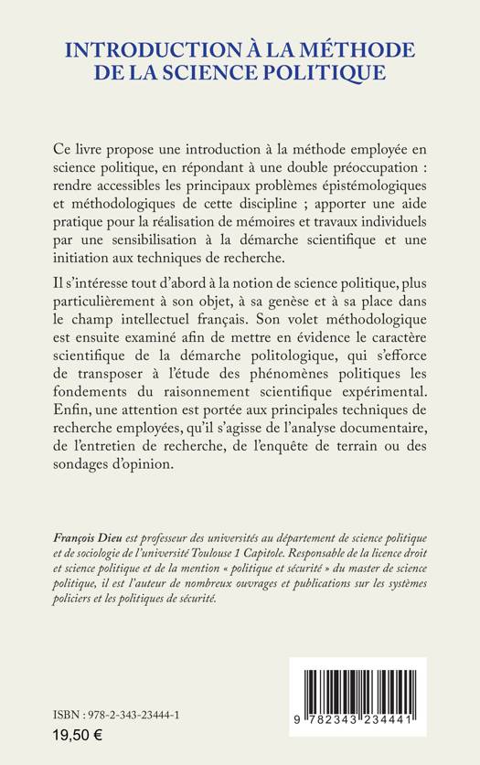 Cet ouvrage propose une introduction à la méthode employée en science politique, en répondant à une double préoccupation : rendre accessibles les principaux problèmes épistémologiques et méthodologiques de cette discipline ; apporter une aide pratique pour la réalisation de mémoires et travaux individuels par une sensibilisation à la démarche scientifique et une initiation aux techniques de recherche. Il s’intéresse tout d’abord à la notion de science politique, plus particulièrement à son objet, à sa genèse et à sa place dans le champ intellectuel français. Son volet méthodologique est ensuite examiné afin de mettre en évidence le caractère scientifique de la démarche politologique, qui s’efforce de transposer à l’étude des phénomènes politiques les fondements du raisonnement scientifique expérimental. Enfin, une attention est portée aux principales techniques de recherche employées, qu’il s’agisse de l’analyse documentaire, de l’entretien de recherche, de l’enquête de terrain ou des sondages d’opinion.