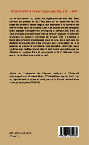 Le défi de ce livre est d'expliquer à partir d'éléments anthropologiques nouveaux le fonctionnement ou plus précisément les dysfonctionnements de l'Etat béninois. Il sera abordé dans une première partie l'Etat à travers les considérations théoriques et anthropologiques et dans une seconde partie le régime politique organisé par la constitution du 11 décembre 1990.