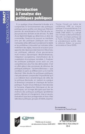 Il y a quelque chose d’essentiel à étudier et à comprendre le fonctionnement des politiques publiques parce qu’elles sont devenues l’élément premier de caractérisation d’un État de plus en plus producteur de biens et de services. Au-delà d’une légitimité légale qui détermine un droit de commander, l’exercice du pouvoir se manifeste ainsi par des politiques publiques aussi bien instituantes (elles définissent socialement la réalité et les problèmes à résoudre) qu’instituées (elles mobilisent des règles, ressources et acteurs pour apporter des réponses à des besoins). Désormais, ces politiques relèvent d’une gouvernance multi-niveaux (dynamiques décentralisatrices, intégration européenne, intensification de la coopération économique mondiale…). Analyser les politiques publiques ouvre aussi sur une compréhension plus fine des démocraties. C’est en effet grâce à des promesses de réformes de politiques publiques – les biens électoraux — que candidats et partis se différencient sur le marché électoral. Mais étudier les politiques publiques, c’est précisément comprendre l’impossibilité qu’il y a à déduire leurs caractéristiques de celles de la politique électorale, en mettant en exergue la dimension complexe et chaotique de l’action publique. À partir d’une littérature internationale et française, d’approches théoriques et de cas empiriques, cet ouvrage décrypte aussi bien les chaînons des politiques publiques (problèmes publics, décision et changement, mise en oeuvre, évaluation) que leurs protagonistes et leurs rôles (décideurs politiques, groupes d’intérêt, experts).