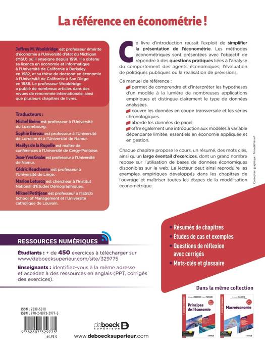 Chaque chapitre propose le cours, un résumé, des mots clés, ainsi qu’un large éventail d’exercices, dont un grand nombre repose sur l’utilisation de bases de données économiques disponibles sur le web. Le lecteur peut ainsi reproduire les exemples empiriques développés dans les chapitres de l’ouvrage et maîtriser toutes les étapes de la modélisation économétrique.