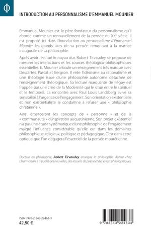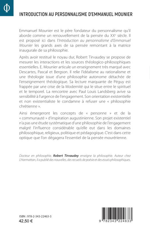 Emmanuel Mounier est le père fondateur du personnalisme qu'il aborde comme un renouvellement de la pensée du XXe siècle. Cet ouvrage en retrace les grands axes et remonte à la matrice inaugurale de sa philosophie. Après en avoir restitué le noyau dur, l'auteur se propose de mesurer les interactions et les sources théologico-philosophiques essentielles. Mounier articule en effet un enseignement très marqué avec Descartes, Pascal et Bergson. Il relie l'idéalisme au rationalisme et une théologie issue d'une philosophie autonome détachée de l'enseignement théologique. Sa lecture marquante de Péguy est frappée par une crise de la Modernité qui le situe entre le spirituel et le temporel. La rencontre avec Landsberg avive sa sensibilité à l'urgence de l'engagement. Son orientation existentielle et non existentialiste le condamne à refuser une philosophie chrétienne . Ainsi émergeront les concepts de personne et de la communauté d'inspiration augustinienne.