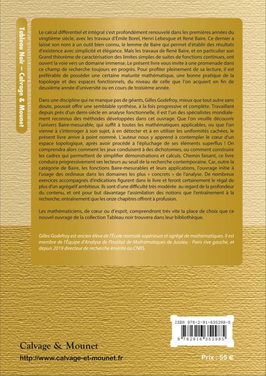Dans une discipline qui ne manque pas de géants, Gilles Godefroy, mieux que tout autre sans doute, pouvait offrir une semblable synthèse, à la fois progressive et complète. Travaillant depuis près d'un demi-siècle en analyse fonctionnelle, il est l'un des spécialistes mondialement reconnus des méthodes développées dans cet ouvrage. Que l'on veuille découvrir l'univers Baire-mesurable, qui suffit à toutes les mathématiques applicables, ou que l'on vienne à s'interroger à son sujet, à en détecter et à en utiliser les uniformités cachées, le présent livre arrive à point nommé. L'auteur nous y apprend à contempler le coeur d'un espace topologique, après avoir procédé à l'épluchage de ses éléments superflus ! On comprendra alors comment les jeux conduisent à des dichotomies, ou comment construire les cadres qui permettent de simplifier démonstrations et calculs. Chemin faisant, ce livre conduira progressivement ses lecteurs au seuil de la recherche contemporaine. Car, outre la catégorie de Baire, les fonctions Baire-mesurables et leurs applications, l'ouvrage initie à l'usage des ordinaux dans les domaines les plus « concrets » de l'analyse. De nombreux exercices accompagnés d'indications figurent dans le livre et feront certainement le régal de plus d'un agrégatif ambitieux. Ils sont d'une difficulté très modérée au regard de la profondeur du contenu, et ont pour but davantage l'assimilation des notions que l'entraînement à la recherche, entraînement que les onze chapitres offrent à profusion.