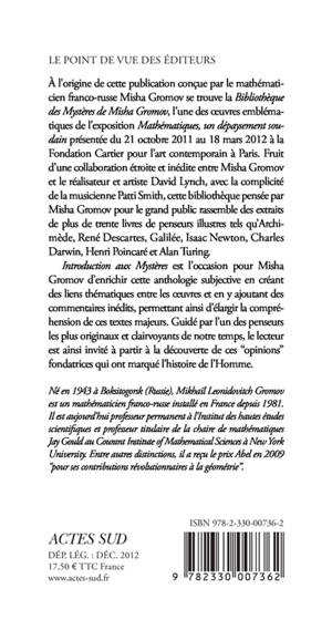À l'origine de cette publication se trouve la Bibliothèque des Mystères, l'une des oeuvres emblématiques de l'exposition «Mathématiques, un dépaysement soudain», fruit d'une collaboration étroite et inédite entre Misha Gromov et le réalisateur et artiste David Lynch, avec la complicité de la musicienne Patti Smith. Cette bibliothèque pensée par Misha Gromov pour le grand public rassemble trente livres choisis par lui, présentés sous la forme d'une installation sonore et film