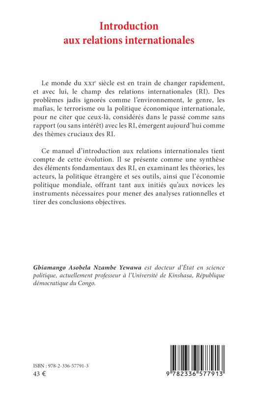 Le monde du XXIᵉ siècle est en train de changer rapidement, et avec lui, le champ des relations internationales (RI). Des problèmes jadis ignorés comme l'environnement, le genre, les mafias, le terrorisme ou la politique économique internationale, pour ne citer que ceux-là, considérés dans le passé comme sans rapport (ou sans intérêt) avec les RI, émergent aujourd'hui comme des thèmes cruciaux des RI. Ce manuel d'introduction aux relations internationales tient compte de cette évolution. Il se présente comme une synthèse des éléments fondamentaux des RI, en examinant les théories, les acteurs, la politique étrangère et ses outils, ainsi que l'économie politique mondiale, offrant tant aux initiés qu'aux novices les instruments nécessaires pour mener des analyses rationnelles et tirer des conclusions objectives.