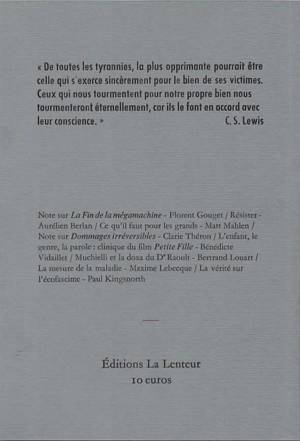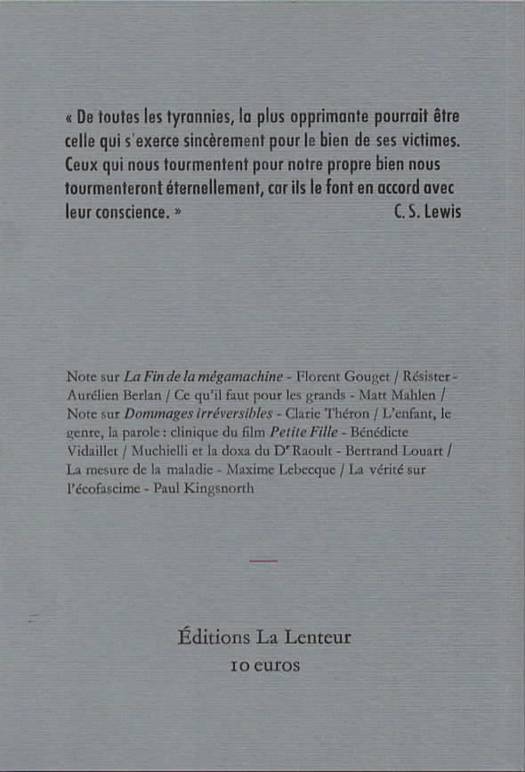 La vérité sur l'écofacisme, ou l'environnementalisme détourné par les technocrates, par Paul Kingsnorth / La mesure de la maladie. Une critique de l'evidence-based medecine, par Maxime Lebecque / Mucchielli et la doxa du docteur Raoult, par Bertrand Louart / Résister, par Aurélien Berlan / L'enfant, le genre, la parole : clinique du film petite fille, par Bénédicte Vidaillet / Note sur Dommages irréversibles d'Abigail Shrier, par Clarie Théron / Ce qu'il faut pour les grands, par Matt Mahlen / Note sur La Fin de la mégamachine, de F. Sheidler, par Florent Gouget