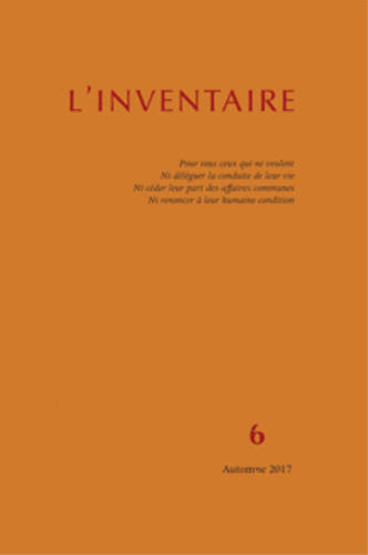 Notre revue tente de faire progresser l'inventaire de ce qui, en théorie et en pratique, reste à défendre, mérite d'être reconsidéré ou doit être écarté pour favoriser l'émancipation individuelle et collective. Nous espérons ainsi, en diffusant d'anciennes idées et en en proposant de nouvelles, contribuer à l'élaboration d'une culture critique commune. Au sommaire de ce numéro 6: Alfonso Berardinelli, «Limite et mémoire, variations sur Christopher Lasch»; Aurélien Berlan, «Le citoyen augmenté»; Louis Mercier-Vega, «Sociétés d'hier et d'aujourd'hui »; Notes de lecture et poèmes.