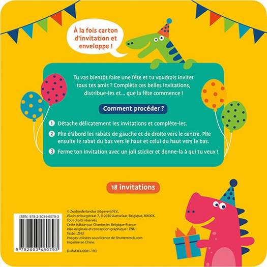 À la fois carton d'invitation et enveloppe Tu vas bientôt faire une fête et tu voudrais inviter tous tes amis ? Complète ces belles invitations, distribue-les et… que la fête commence ! Comment procéder ? 1. Détache délicatement les invitations et complète-les. 2. Plie d'abord les rabats de gauche et de droite vers le centre. Plie ensuite le rabat du bas vers le haut et celui du haut vers le bas. 3. Ferme ton invitation avec un joli sticker et donne-la à qui tu veux ! 18 invitations À la fois carton d'invitation et enveloppe