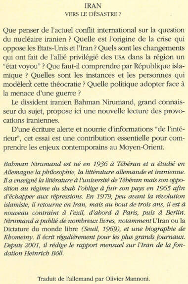 Qu'est-ce qui rend l'Iran - contrairement au Pakistan ou à l'Inde - si dangereux au point que les Etats-Unis l'élèvent au rang d'ennemi numéro un ? Quels sont les changements qui ont fait de l'ancien allié privilégié des Etats-Unis dans la région un état voyou ? Que faut-il comprendre par République Islamique ? Quelles sont les instances et les personnes qui modèlent cette théocratie ? Comment est-elle organisée de l'intérieur ? Tout en répondant à ces questions, l'auteur écrit la chronique de la question nucléaire, ce jeu de cache-cache entre les puissances du monde et un état qui semble déterminé à ne pas se laisser faire.
