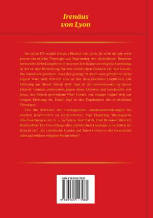 Im Jahre 178 wurde Irenäus Bischof von Lyon. Er wird als der erste grosse christliche Theologe.und Begründer des christlichen Denkens betrachtet. Er bekämpfte eine in seiner Zeit blühende religiöse Strömung, in der er eine Bedrohung für den christlichen Glauben sah: die Gnosis. Die Gnostiker glaubten, dass der geistige Mensch vom göttlichen Geist regiert wird und letztlich eins ist mit dem höchsten Göttlichen. Die Erlösung aus dieser 'bösen Welt' liegt in der Bewusstwerdung dieser Einheit. Irenäus polemisiert gegen diese Ketzerei und beschreibt, wie Jesus, das Fleisch gewordene Wort Gottes, der einzige wahre Weg zur ewigen Erlösung ist. Damit legt er das Fundament der christlichen Theologie.Um die Relevanz der theologischen Auseinandersetzungen im zweiten Jahrhundert zu verdeutlichen, fügt Meijering 'theologische Abschweifungen' ein (u. a. zu Calvin, Karl Barth, Emil Brunner, Dietrich Bonhoeffer). Die Grundfrage aller christlichen Theologie aller Zeiten ist: Bezieht sich der christliche Glaube auf Taten Gottes in der Geschichte oder auf zeitlose religiöse Wahrheiten?