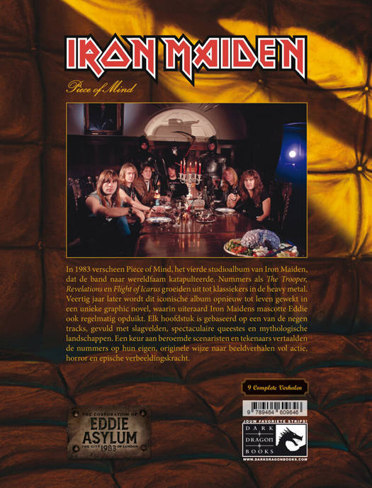 In 1983 verscheen Piece of Mind, het vierde studioalbum van Iron Maiden, dat de band naar wereldfaam katapulteerde. Nummers als The Trooper, Revelations en Flight of Icarus groeiden uit tot klassiekers in de heavy metal. Veertig jaar later wordt dit iconische album opnieuw tot leven gewekt in een unieke graphic novel, waarin uiteraard Iron Maidens mascotte Eddie ook regelmatig opduikt. Elk hoofdstuk is gebaseerd op een van de negen tracks, gevuld met slagvelden, spectaculaire queestes en mythologische landschappen. Een keur aan beroemde scenaristen en tekenaars vertaalden de nummers op hun eigen, originele wijze naar beeldverhalen vol actie, horror en epische verbeeldingskracht.