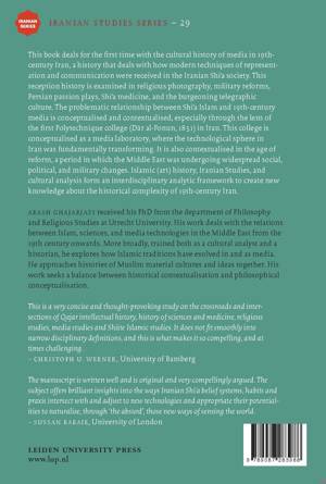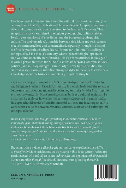 This book deals for the first time with the cultural history of media in nineteenth-century Iran, a history that deals with how modern techniques of representation and communication were received in the Iranian Shi.a society. This reception history is examined in religious photography, military reforms, Persian passion plays, Shi.a medicine, and the burgeoning telegraphic culture. The problematic relationship between Sh..a Islam and 19th-century media is conceptualised and contextualised, especially through the lens of the first Polytechnique college (D.r al-Fonun, 1851) in Iran. This college is conceptualised as a media laboratory, where the technological sphere in Iran was fundamentally transforming. It is also contextualised in the age of reform, a period in which the Middle East was undergoing widespread social, political, and military changes. Islamic (art) history, Iranian Studies, and cultural analysis form an interdisciplinary analytic framework to create new knowledge about the historical complexity of 19th-century Iran.