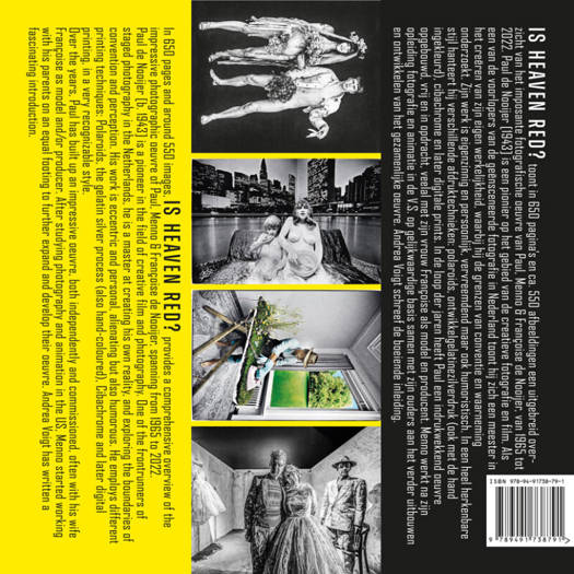 IS HEAVEN RED? toont in 650 pagina’s en ca. 550 afbeeldingen een uitgebreid overzicht van het imposante fotografische oeuvre van PAUL, MENNO & FRANÇOISE DE NOOIJER, van 1965 tot 2022. Paul de Nooijer [1943] is een pionier op het gebied van de creatieve fotografie en film. Als een van de voorlopers van de geënsceneerde fotografie in Nederland toont hij zich een meester in het creëren van zijn eigen werkelijkheid, waarbij hij de grenzen van conventie en waarneming onderzoekt. Zijn werk is eigenzinnig en persoonlijk, vervreemdend maar ook humoristisch. In een heel herkenbare stijl hanteert hij verschillende afdruktechnieken: polaroids, ontwikkelgelatinezilverdruk (ook met de hand ingekleurd), cibachrome en later digitale prints.
