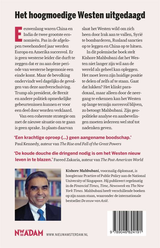 Eeuwenlang waren China en India de twee grootste economieën. Pas in de afgelopen 200 jaar werden Europa en Amerika succesvol. Er is geen westerse leider die durft te zeggen dat er nu aan deze periode van westerse hegemonie een einde komt. Maar de bevolking ondervindt wel dagelijks de gevolgen van deze aardverschuiving. Trump als president, de Brexit en andere politiek opmerkelijke gebeurtenissen kunnen er voor een deel door worden verklaard. Van een coherente strategie om met de nieuwe situatie om te gaan is geen sprake. In plaats daarvan slaat het Westen wild om zich heen door Irak aan te vallen, Syrië te bombarderen, Rusland sancties op te leggen en China op te hitsen.In dit polemische boek stelt Kishore Mahbubani dat het Westen niet langer zijn wil aan de wereld als geheel kan opleggen. Het moet leren zijn huidige positie te delen of zelfs af te staan. Gaat dat lukken? Het klinkt paradoxaal, maar alleen door de neergang te erkennen kan het Westen op lange termijn succesvol blijven, zo betoogt Mahbubani. Zijn geopolitieke analyse en aanbevelingen moeten iedereen wel stof tot nadenken geven. 'Een verontrustend boek (...) en geen aangename boodschap.' Paul Kennedy, auteur van The Rise and Fall of the Great Powers'De koude douche die dringend nodig is om het Westen nieuw leven in te blazen.' Fareed Zakaria, auteur van The Post-American World