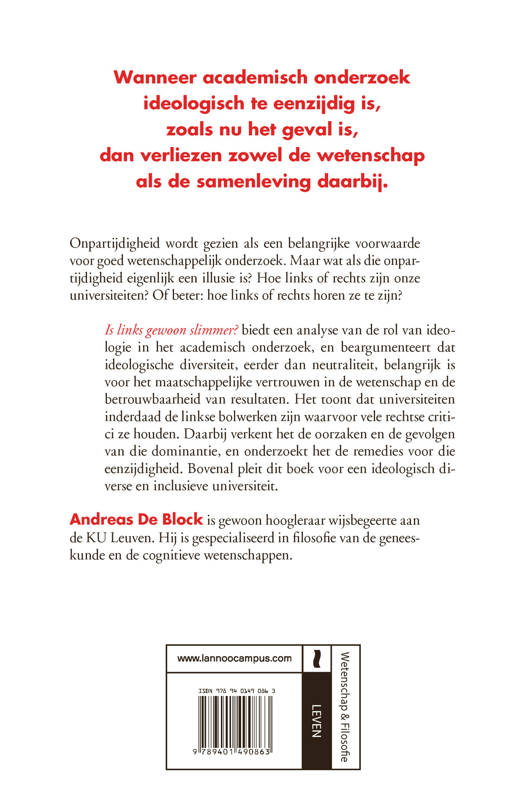 Wanneer academisch onderzoek ideologisch te eenzijdig is, zoals nu het geval is, dan verliezen zowel de wetenschap als de samenleving daarbij. Onpartijdigheid wordt gezien als een belangrijke voorwaarde voor goed wetenschappelijk onderzoek. Maar wat als die onpartijdigheid eigenlijk een illusie is? Hoe links of rechts zijn onze universiteiten? Of beter: hoe links of rechts horen ze te zijn? Is links gewoon slimmer? biedt een analyse van de rol van ideologie in het academisch onderzoek, en beargumenteert dat ideologische diversiteit, eerder dan neutraliteit, belangrijk is voor het maatschappelijke vertrouwen in de wetenschap en de betrouwbaarheid van resultaten. Het toont dat universiteiten inderdaad de linkse bolwerken zijn waarvoor vele rechtse critici ze houden. Daarbij verkent het de oorzaken en de gevolgen van die dominantie, en onderzoekt het de remedies voor die eenzijdigheid. Bovenal pleit dit boek voor een ideologisch diverse en inclusieve universiteit.