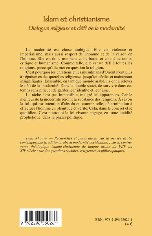 La modernité est un défi à toutes les religions car elle met en question la religion. C'est pourquoi les chrétiens et les musulmans d'Orient n'ont plus à s'épuiser en des querelles religieuses. Ils ont à relever le défi de la modernité dans le but de survivre dans ces temps sans pitié et de garder leur identité et leur âme. Cette tâche n'est pas impossible car le meilleur de la modernité rejoint la substance des religions.